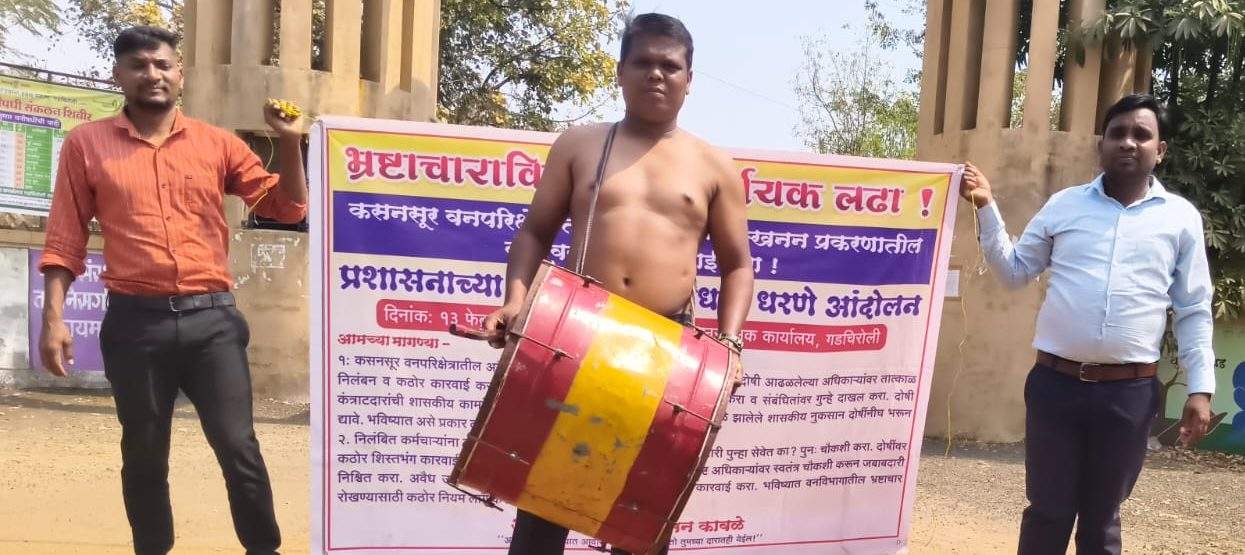 Gadchiroli Feb. 25 (District Correspondent) A ‘half-naked dhol bajao’ agitation was held today under the leadership of social activist Mukesh Kawale to protest against illegal murrum mining in Kasansur forest area of ​​Bhamragad forest division and the inaction of the administration. The protest was held in front of the office of the Chief Conservator of Forests here to draw the attention of the administration.